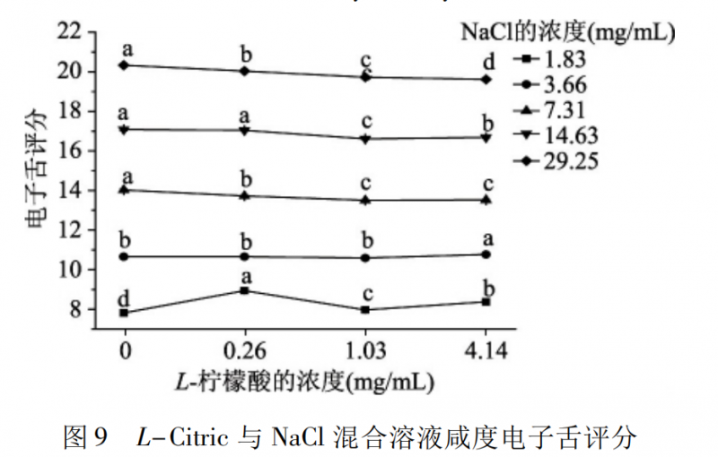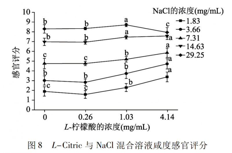 圖8 是 L-Citric 與 NaCl 混合溶液咸度的感官評定結果。在相同的氯化鈉濃度水平下,添加 0.26 mg /mL L-檸檬酸的混合溶液與氯化鈉溶液的咸度沒有顯著差異( p > 0.05) ,添加 1.03、4.14 mg /mL L-檸檬酸的混合溶液的咸度則顯著高于氯化鈉溶液的咸度( p <0.05) ; 但是在 29.25 mg /mL 氯化鈉濃度下添加4.14 mg /mL L-檸檬酸時,混合溶液的咸度則受到抑制,不同的味道在口中具有不同的傳導途徑,當氯化鈉和檸檬酸的濃度過高時,檸檬酸會對氯化鈉的味覺傳導途徑產(chǎn)生影響,阻礙了氯化鈉咸度的感知。