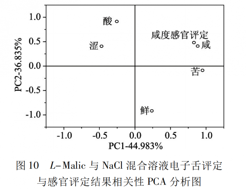 對L-Malic與 NaCl 混合溶液的感官咸度評分和電子舌所測得的咸、酸、苦、澀、鮮五組數(shù)據(jù)進行主成分分析( 如圖 10 所示) 。PC1 和 PC2 累積方差貢獻率為81.818%,“感官咸度評分”和電子舌數(shù)據(jù)“咸”在圖上位置相近,表明電子舌對溶液咸度的評分“咸”與感官咸度評分相關性較高。