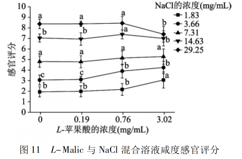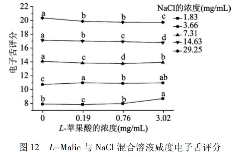 圖 11 是 L-Malic 與 NaCl 混合溶液咸度的感官評定結果。在 1.83、3.66 mg /mL 的氯化鈉濃度下,添加 0.76、3.02 mg /mL L-蘋果酸的混合溶液的咸度顯著高于氯化鈉溶液(p < 0.05) ; 在 29.25 mg /mL 氯化鈉濃度下,添加 3.02mg /mL L-蘋果酸的混合溶液的咸度顯著低于氯化鈉溶液(p < 0.05) 。圖 12 是電子舌對溶液咸度的評定結果。在 1.83,3.66 mg /mL 的氯化鈉濃度下,混合溶液的咸度顯著高于氯化鈉溶液( p <0.05) ; 而在其他氯化鈉濃度下,混合溶液的咸度顯著低于氯化鈉溶液( p < 0.05) ,其中在 7.31 mg /mL的氯化鈉濃度下,添加 3.02 mg /mL L-蘋果酸的混合溶液的咸度顯著高于其他兩組混合溶液,但仍顯著低于氯化鈉溶液( p < 0.05) 。將 L-蘋果酸與氯化鈉混合溶液咸度的感官評定結果和電子舌評定結果進行相關性分析,發(fā)現(xiàn)其相 關 性 系 數(shù) r = 0.984 ( p <0.01) 。