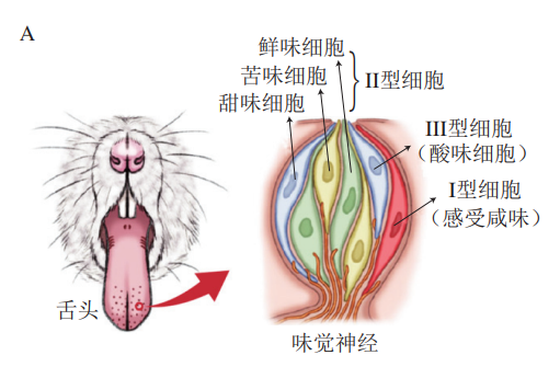 味蕾是人體的味覺(jué)感受器,其超微結(jié)構(gòu)含有多種味覺(jué)細(xì)胞,負(fù)責(zé)感受甜、苦、咸、酸和鮮等風(fēng)味,在味覺(jué)感知的過(guò)程中起關(guān)鍵作用。味蕾的超微結(jié)構(gòu)如圖1A所示,苦、甜和鮮味刺激由II型細(xì)胞檢測(cè),酸味刺激由III型細(xì)胞檢測(cè),而檢測(cè)咸味刺激的味蕾細(xì)胞尚未明確,Chandrashekar等通過(guò)對(duì)嚙齒類動(dòng)物味覺(jué)細(xì)胞的研究發(fā)現(xiàn),咸味的感知主要與I型類膠質(zhì)細(xì)胞有關(guān)。咸味的感知途徑為刺激物作用于味覺(jué)細(xì)胞的頂端致使細(xì)胞膜發(fā)生去極化,產(chǎn)生動(dòng)作電位,從而釋放神經(jīng)遞質(zhì)并發(fā)生傳遞,最終傳入神經(jīng)反饋大腦。刺激物的不同,所引導(dǎo)的感知與傳遞不同。目前常見(jiàn)的咸味刺激物主要是以NaCl為主的金屬鹽類,但隨著研究的不斷深入,非金屬離子的咸味刺激物不斷涌現(xiàn)。非金屬離子類刺激物非金屬離子的咸味刺激物以氨基酸、核苷酸和小分子多肽為代表,其涉及受體和咸味傳導(dǎo)途徑復(fù)雜。