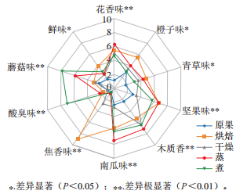 10種描述詞被選取用于5種處理后沙棗的感官評價:花香、橙子味、青草味、堅果味、木質(zhì)香、南瓜味、焦香味、酸臭味、蘑菇味、鮮味,根據(jù)描述繪制風味輪廓圖,結(jié)果如圖3所示。不同方式預處理后的沙棗在所有感官屬性上的香氣強度均存在顯著差異(0.01<P<0.05),其中花香味、堅果味、木質(zhì)香、南瓜味、焦香味、酸臭味和蘑菇味這幾種感官屬性存在極顯著差異(P<0.01)。