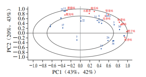 特征香氣強度相應值與感官特征參數(shù)相關(guān)性分析結(jié)果 PLSR是一種基于因子的多元回歸將數(shù)據(jù)分解為不同PC,并建立預測校準模型的方法。如圖6所示,位于同一象限的樣本之間相關(guān)性較強,感官屬性與同象限變量相互接近,具有正相關(guān),與對角象限中的變量,具有負相關(guān)。PLSR模型解釋了63%的X變量和85%的Y變量。青草香、花香的屬性與壬醛(9)、2-壬酮(5)4-(2-呋喃基)-3-丁烯-2-酮(29)、壬醛(6)呈正相關(guān)、焦香的屬性與2,6-二甲基吡嗪(4)、糠醇(20)、2-吡咯甲醛(34)呈正相關(guān),與己酸(25)、庚酸(11)、1-辛烯-3-醇(10)呈負相關(guān),而這3種物質(zhì)對蘑菇味和酸臭味的屬性具有正向影響,這些與感官評價結(jié)果中的感官評分具有很好的一致性(圖2)。