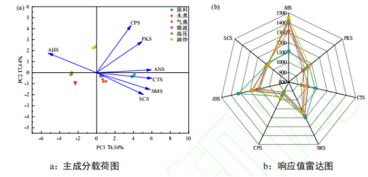 為比較不同烹飪方式對芫根整體滋味的影響,對樣品進行電子舌分析,結果如圖3所示。電子舌主成分分析中,第一主成分(PC1)和第二主成分(PC2)的貢獻率分別為74.54%和17.44%,總貢獻率達91.98%,已超過85%,說明這兩個主成分涵蓋了絕大多數(shù)樣品信息,可以用來表征芫根的滋味特征。主成分載荷圖中,以散點代表各個樣品,距離越近,表明樣本滋味相似度越高,對主成分貢獻大的影響因子以射線形式表示出來,影響因子越靠近樣品表明對相應樣品影響越大。6種芫根樣品分散區(qū)域明顯,表明電子舌能夠較好的區(qū)分不同烹飪方式的芫根。新鮮芫根與其他5種芫根樣品距離較遠,ANS和CTS傳感器對其影響較大,其中CTS傳感器對咸味具有特敏性,結合圖3b可知,新鮮芫根在ANS和鮮味特敏傳感器NMS上響應值較高,在咸味CTS和酸味AHS傳感器上響應值次之,烹飪后,鮮味NMS傳感器響應值減弱,咸味CTS響應值也明顯降低,酸味AHS響應值增強,說明烹飪處理會減弱芫根本身的咸鮮味,突出酸味。油炒的芫根整體響應值較大,與其他樣品距離較遠,說明油炒的與其他烹飪處理的芫根整體滋味差異較大,一方面是因為油炒溫度較高導致,另一方面食用油也會對芫根滋味產(chǎn)生影響。水煮和氣蒸的芫根在主成分圖中距離較近,說明這兩種方式烹飪的芫根整體滋味相似;同理可得微波和高壓烹飪的芫根滋味相似。