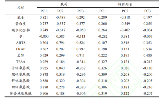 取100g樣品,利用食品熱量成分檢測儀測定樣品中的能量、蛋白質、脂肪、碳水化合物和水分含量。 總酚含量以沒食子酸為參照物,采用Folin-Ciocalteus法測定;抗氧化能力采用鐵離子抗氧化能力法測定,均以維生素E(Trolox,TE)為標準對照。 取30g樣品,加270mL蒸餾水,利用破壁機制成勻漿,過濾,取100mL濾液上機。電子舌分析條件:采集120s,清洗180s。