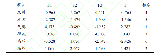 通過計算得到不同烹飪方式的芫根的綜合品質得分,得分高低反映芫根品質的高低,如表5所示,PC1中得分最高的是氣蒸芫根和油炒芫根,說明PC1對這兩種方式烹飪的芫根品質有較大影響;PC2中微波的芫根得分最高,說明ABTS抗氧化能力對其品質影響最大;PC3中新鮮芫根得分最高。根據(jù)綜合評分排名情況來看,不同烹飪方式處理后的芫根品質存在較大差異,氣蒸芫根綜合得分最高,其次是油炒芫根,高壓芫根得分最低。