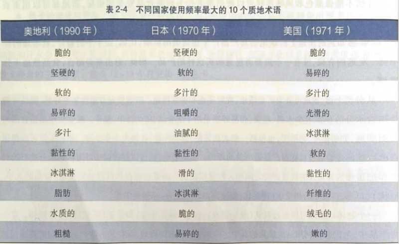 一定的質(zhì)地術(shù)語(yǔ)和感覺(jué)可以跨越文化的差異,具有國(guó)際性。因此,任何國(guó)家、文化或地區(qū)的感官專(zhuān)家應(yīng)當(dāng)不僅僅注意食品可感知到的風(fēng)味、味道和顏色的量值,而且要注意能感知到的質(zhì)地特征。有研究表明:不同國(guó)家的質(zhì)地描述詞匯大多數(shù)是相同的,如表2-4所示。