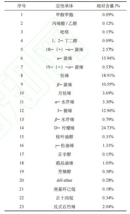 表1 胡椒精油揮發(fā)性物質(zhì)種類及相對含量