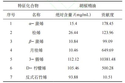 胡椒精油中各香氣成分的貢獻(xiàn)度。越南胡椒精油中貢獻(xiàn)度由大到小進行排序:3-蒈烯>月桂烯>D-檸檬烯>α-蒎烯>檜烯>β-蒎烯>反式石竹烯。