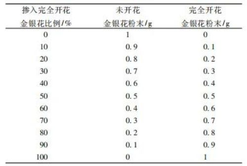未開花與完全開花金銀花打粉,過4號篩,取過篩后的未開花與完全開花金銀花粉末調(diào)配為總量為1g待測樣品,充分震蕩混勻,具體調(diào)配比例見表1,并以此分組。