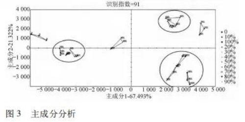 PCA是將所得的數(shù)據(jù)進行降維,提取幾個特征值較大能反映樣本信息變量的因子進行線性分類,以得到具有不同氣味區(qū)域和簇的描述性圖表。在經(jīng)過超快速氣相電子鼻檢測得到不同調(diào)配比例金銀花粉末的色譜峰面積以及峰數(shù)量后,篩選出區(qū)分能力強(>0.900)且峰面積較大(range>1000)分離效果較好的色譜峰作為傳感器,進行PCA分析,得出主成分1與主成分2累計貢獻率88.815%,能夠較好地反映所測樣品中氣味信息。識別指數(shù)91,說明超快速氣相電子鼻可有效區(qū)分不同調(diào)配比例金銀花粉末,見圖3。此外,10%~20%,20%~30%,50%~60%,80%~90%,90%~100%間區(qū)分較為困難。據(jù)此,可將不同調(diào)配比例金銀花粉末可分為6類,即①0;②10%,20%,30%;③40%;④50%,60%;⑤70%;⑥80%,90%,100%。