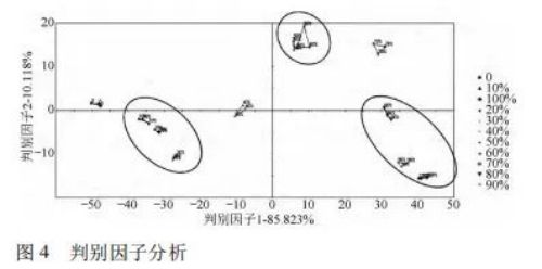 DFA是在主成分分析的基礎上,縮短組內(nèi)樣品間距離,增大組間差距。因此,本研究以主成分分析中所采用的傳感器,進行判別因子分析,結(jié)果見圖4。由此可知,各調(diào)配比例的金銀花粉末可通過超快速氣相電子鼻進行快速鑒別,而且區(qū)分效果較好,所得趨勢及結(jié)果與主成分分析基本相同,使PCA結(jié)果得到進一步驗證。