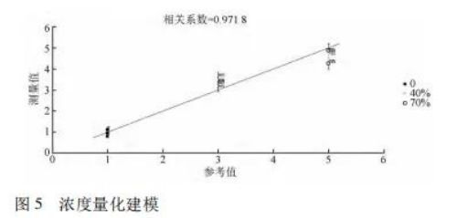 濃度量化建模采用的方法為偏最小二乘法(PLS),可使色譜圖數(shù)據(jù)與濃度值間建立線性關(guān)系,起到對未知樣品濃度進行預測的作用。本實驗中采用預先調(diào)配的金銀花粉末,將摻入完全開花粉末比例設為濃度,即濃度量化建模中的因變量,以所測得氣相色譜圖數(shù)據(jù)作為自變量,進行濃度量化建模。為實現(xiàn)較好的鑒別結(jié)果,將PCA及DFA組間區(qū)分較為良好的0,40%,70%完全開花金銀花粉末摻入比例作為節(jié)點,并將0,40%,70%濃度分別設為1,3,5,進行濃度量化建模,所得結(jié)果見圖5,相關(guān)系數(shù)為0.9718。建模后,將10%,20%,30%,50%,60%,80%,90%,100%的原始色譜數(shù)據(jù)進行投影驗證,可得到較好的濃度預測結(jié)果,模型良好。另外,根據(jù)此模型,可實現(xiàn)基于摻入完全開花金銀花粉末比例的質(zhì)量分級,即濃度預測結(jié)果小于3,為金銀花粉末中摻入完全開花粉末量低于40%,列為一等;濃度預測結(jié)果不低于3且小于5,為金銀花粉末中摻入完全開花粉末量在40%~70%,列為二等;濃度預測結(jié)果不低于5,為金銀花粉末中摻入完全開花粉末量不低于70%,列為三等。