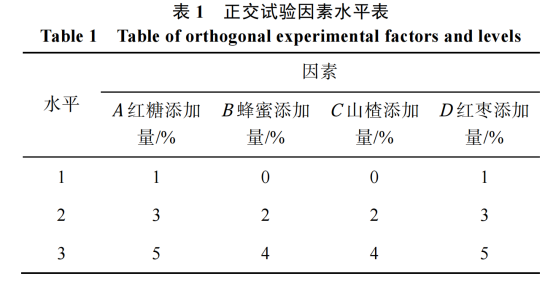 以單因素試驗為基礎, 選擇紅糖、蜂蜜、山楂、紅棗的添加量為正交試驗的 4 個因素, 采用四因素三水平 L9(34)正交試驗, 綜合產(chǎn)品的感官評分值和極差分析得到 4 個因素的最佳添加量, 正交試驗因素水平見表 1。