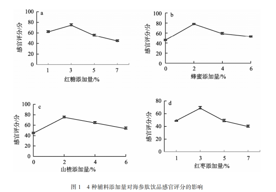 首先選擇 7 種具有一定營養(yǎng)價值的藥食同源的輔料進行海參肽飲品調(diào)配, 其次選擇對飲品感官品質影響較明顯的紅糖、蜂蜜、山楂、紅棗 4 種輔料進行單因素試驗。以海參酶解液為基礎, 添加重量計為 100%, 其中加入酶解液添加重量 0.3%的桑葚粉、0.3%的藍莓粉和 1%的茉莉花, 制成海參肽復配液為固定值, 感官評分為指標。固定 2%的蜂蜜添加量, 2%的山楂添加量, 3%的紅棗添加量, 考察紅糖添加量為 1%、3%、5%和 7%對海參肽飲品感官品質的影響。固定紅糖添加量, 2%的山楂添加量, 3%的紅棗添加量, 考察蜂蜜添加量為 0%、2%、4%和 6%對海參肽飲品感官品質的影響。固定紅糖添加量和蜂蜜添加量, 3%的紅棗添加量, 考察山楂添加量為 0%、2%、4%和6%對海參肽飲品感官品質的影響。固定紅糖、蜂蜜和山楂的添加量, 考察紅棗添加量為 1%、3%、5%和 7%對海參肽飲品感官品質的影響。