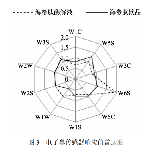 采用主成分分析法(PCA)評價海參肽酶解液與海參肽飲品的揮發(fā)性特征。由圖 2 可知, 主成分 1 的方差貢獻率為 86.19%, 主成分2 的方差貢獻率為 11.28%, 兩成分的總貢獻率為97.47% (>85%), 說明這 2 個主成分可以反映樣品香氣的整體信息。樣品在第一主成分上的距離越大, 則差異越大。由圖 2 可以看出, 2 種樣品在第一主成分上距離較大, 說明2 種樣品間的氣味成分差異較大, 產(chǎn)生這種現(xiàn)象的原因可能是添加輔料中的成分所起的作用。本研究選用 140 s 時各傳感器穩(wěn)態(tài)響應值作為分析點建立雷達圖, 各傳感器響應值越高表明相對應的該類物質含量越高。如圖3 所示, W5S、W6S、W5C、W2S、W2W 和 W3S 傳感器對海參肽飲品的香氣敏感, 表明氮氧化物、氫化物、烷烴、醇類、硫化氫類、芳香烷烴這些物質在海參肽飲品中含量較高。