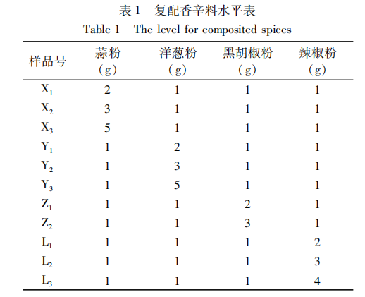 x組為蒜粉添加量變化組 ,Y組為洋蔥粉添加量變化組 ,Z組為黑胡椒粉添加量變化組 ,L組為辣椒粉添加量變化組 ,具體配方見表 1。取雞大胸肉將調(diào)料與鮮肉充分混合后,一定溫度下烘烤。
