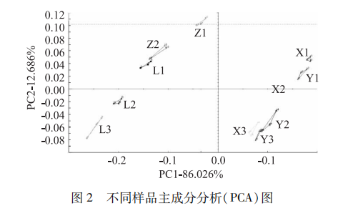 由圖 2 還可見 , 單一香辛料添加量不同時(shí),在PCA分析圖中可表現(xiàn)出有區(qū)分度的差異,x組、Y 組、Z組和L組中的樣品都隨著香辛料添加量的變化呈現(xiàn)出線性變化的趨勢。這表明,PCA分析也可運(yùn)用于識(shí)別單一香辛料的添加量。