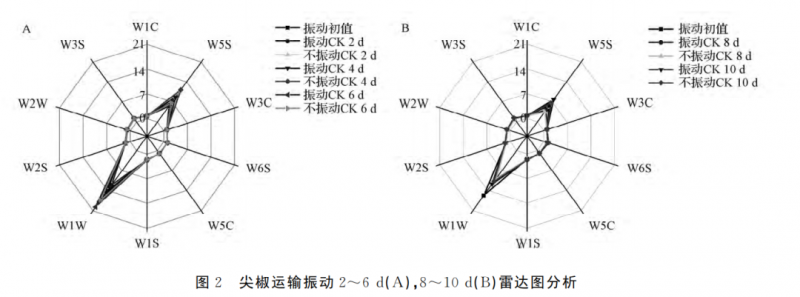 由圖6青圓椒的振動(dòng)PCA 所示,青圓椒振動(dòng)CK 組和不振 動(dòng) CK 組(A 組)在貯藏時(shí)間內(nèi),氣味變化并不明顯,以青圓椒貯藏2d和10d為例,做青圓椒的 振動(dòng)雷達(dá)圖,如圖6(A)和(B)所示。振動(dòng) CK 組和不振動(dòng) CK 組的雷達(dá)圖的外形相近,接近于初值,2號(hào)和7號(hào)傳感器的響應(yīng)值均為最大。運(yùn)輸振動(dòng)后貯藏10d內(nèi)對(duì)青圓椒的氣味影響并不大,不會(huì)影響青圓椒的商品價(jià)值。