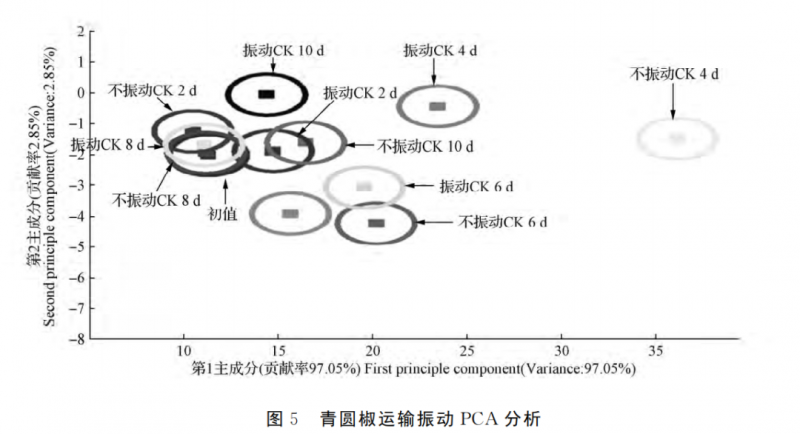 如圖5所 示,為運(yùn)輸振動(dòng) CK 和不振動(dòng) CK青圓椒的 PCA 分析圖(A 組),2組的尖椒主成分1的貢獻(xiàn)率 為 97.05%,主成分 2 的貢獻(xiàn)率為2.85%,總貢獻(xiàn)率 為99.90%。表明2個(gè)主成分已經(jīng)基本代表了樣品的主要信息特征,電子鼻能夠?qū)悠泛唾A藏時(shí)間加以區(qū)分。從 圖5可以看出,青圓椒的振動(dòng) CK 和不振動(dòng) CK10d內(nèi)的揮發(fā)性物質(zhì)成分區(qū)域較為接近,且不同貯藏時(shí)間內(nèi)揮發(fā)性物質(zhì)成分區(qū)域有重疊,說明振動(dòng)組和不振動(dòng)組貯藏10d內(nèi)的青圓椒果實(shí)揮發(fā)性物質(zhì)變化不大,在貯藏期內(nèi),運(yùn)輸振動(dòng)和不振動(dòng)對(duì)青圓椒的氣味影響不大,均可保持青圓椒的香氣。