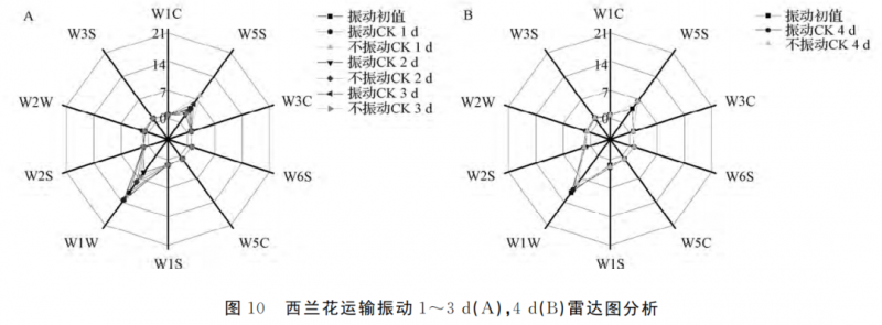 圖10(A)為西蘭花前3d的雷達(dá)圖(B 組),前3d西蘭花的氣味變化并不明顯,均接近初值,說明此時(shí)的西蘭花新鮮,具有商品價(jià)值。4d西蘭花的氣味與 初 值 相 比 明 顯 改 變,2號(hào) 和7號(hào) 傳感器的響應(yīng)值變化明顯,此時(shí)西蘭花腐爛變質(zhì),出現(xiàn)其它氣味,失去商品價(jià)值。不振動(dòng) CK 組的氣味明顯好于振動(dòng) CK 組,說明振動(dòng)影響西蘭花組織表皮細(xì)胞的滲透和細(xì)胞壁的降解,并影響運(yùn)輸后西蘭花的硬度和外部變化,降低商品價(jià)值。