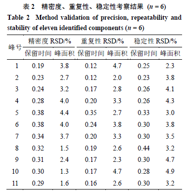 2.5.2 重復(fù)性試驗(yàn) 按“2.3”項(xiàng)下方法平行制備6批供試品粉末,裝于6個(gè)進(jìn)樣瓶中,每份稱取1.0 g,精密稱定,進(jìn)樣分析。結(jié)果(表2)表明,11個(gè)色譜峰的保留時(shí)間和峰面積的RSD最大值分別為0.35%、4.7%,表明方法重復(fù)性較好。