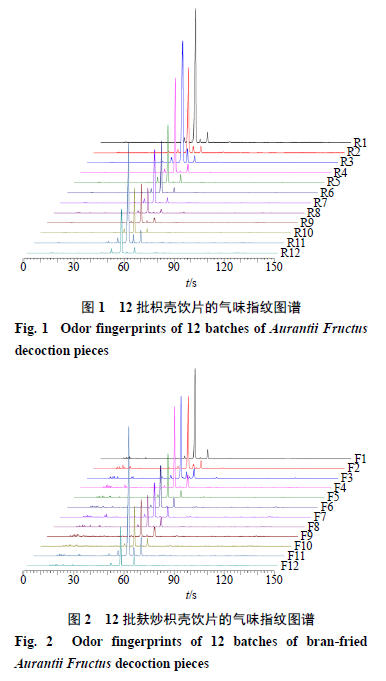 2.6.1 氣味指紋圖譜的建立 基于Heracles NEO超快速氣相電子鼻檢測分析結(jié)果,以MXT-5色譜柱采集的信號建立生、麩炒枳殼飲片樣品氣味指紋圖譜,結(jié)果如圖1、2所示。