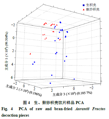 2.6.2 主成分分析(principal component analysis,PCA) PCA是一種無監(jiān)督的模式識(shí)別方法,將數(shù)據(jù)降維處理提取幾個(gè)特征值較大且能反映樣本信息變量的因子進(jìn)行線性分類,可在多維空間直觀顯示樣品間的差異,同時(shí)也可顯示變量之間的分布[11,16]。將超快速氣相電子鼻所分離色譜峰作為影響因子,進(jìn)行PCA,結(jié)果見圖4。在PCA模型中,第1主成分(PC1)貢獻(xiàn)率為99.504%,第2主成分(PC2)貢獻(xiàn)率為0.196%,第3主成分(PC3)貢獻(xiàn)率為0.185 7%,主成分累積貢獻(xiàn)率之和達(dá)99.885 7%,能較好地對生、麩炒枳殼飲片進(jìn)行區(qū)分。