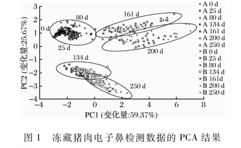 樣品凍結(jié)后,分別在第0、25、80、134、161、200、250天對樣品進(jìn)行電子鼻檢測。樣品每次檢測完成后,迅速用保鮮膜重新密封燒杯放回 -20 ℃繼續(xù)冷凍儲藏,檢測過程中保持低溫使樣品不發(fā)生解凍。