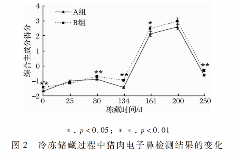 從圖 2可見,在第 0,80,134,161,250天時 A,B兩組間檢測結(jié)果差異顯著,而第 25 和 200 天時 A,B兩組間檢測結(jié)果差異不顯著(p>0.05)。這表明經(jīng)過 7d冷藏后再凍藏的豬肉與新鮮凍藏的豬肉相比可能已經(jīng)發(fā)生了變化,但在凍藏過程中發(fā)生劣變可能又掩蓋了其本身的差異,但隨著凍藏時間的增加其氣味成分的差異又逐漸加大。盡管 200d 時的差異也不顯著,則是可能是由于組內(nèi)變異過大掩蓋了組間差異造成的,其平均值之間的差異仍在增大。
