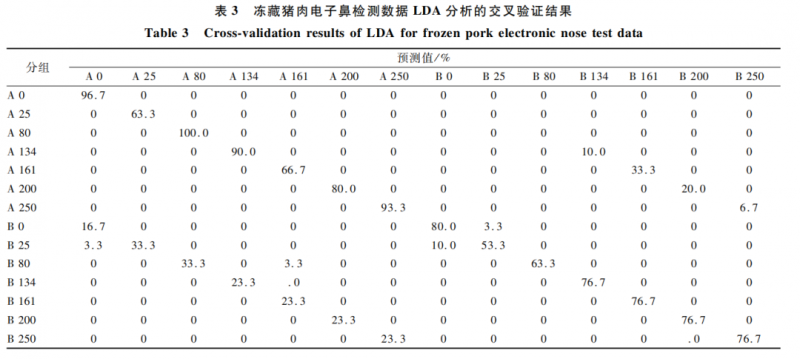 為評估 LDA對豬肉凍藏時間和凍藏前是否經(jīng)過長時間冷藏的鑒別能力,采用“留一法”對樣品進(jìn)行交叉驗證,結(jié)果見表 3。結(jié)果表明對這 14 類樣品的交叉驗證的正確率為 78.1%,值得注意的是即使發(fā)生錯判的樣品也主要是在相同凍藏時間點的 A、B兩組之間,如僅以凍藏時間分組其交叉驗證的正確率高達(dá) 95.6%。這表明利用 LDA對豬肉凍藏時間和凍藏前是否經(jīng)過長時間冷藏均具有較好的鑒定能力。