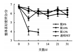 將3種不同質(zhì)量分?jǐn)?shù)的阻光色油PET瓶灌裝的鮮牛奶和透明PET瓶罐裝的鮮牛奶進(jìn)行0~31d感官品評(píng),品評(píng)時(shí)間點(diǎn)分別為0,3,7,14,21和31d,結(jié)果如圖1~圖4所示。在31d內(nèi)各樣品的整體喜好度均呈下降趨勢(shì),其中透明PET瓶明顯不受喜歡,在3d時(shí)整體喜好度平均值<5(透明PET各指標(biāo)只測(cè)試到7d),與3個(gè)阻光色油PET瓶裝樣品相比存在顯著性差異,3個(gè)不同質(zhì)量分?jǐn)?shù)的阻光色油PET樣品的整體喜好度平均值相比均無(wú)顯著性差異,整體下降趨勢(shì)不明顯,均優(yōu)于透明PET瓶樣品。