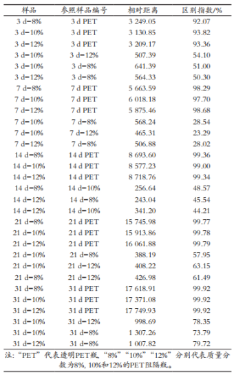 從表2獲知,在相同時(shí)間點(diǎn)內(nèi),透明PET樣品與3個(gè)不同質(zhì)量分?jǐn)?shù)阻光色油樣品的區(qū)別指數(shù)均較大,即從初始測(cè)試時(shí)間3d起,透明PET瓶就與阻光色油PET樣品的相對(duì)距離較大,區(qū)別指數(shù)均在92%以上,而且隨著光照時(shí)間的增加,透明PET瓶與阻光色油PET瓶相對(duì)距離不斷增大,進(jìn)一步表明,透明PET樣品與3個(gè)阻光色油PET樣品差異最大。反觀3個(gè)阻光色油PET樣品之間互相比較的區(qū)別指數(shù)、相對(duì)距離相似無(wú)明顯差別,兩兩之間無(wú)明顯相近的樣品,這與感官測(cè)評(píng)結(jié)果一致,阻光PET瓶的樣品更穩(wěn)定。