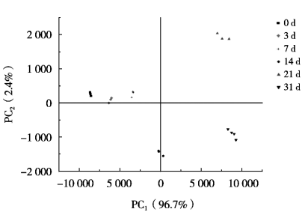 透明PET樣品與3個(gè)不同質(zhì)量分?jǐn)?shù)的阻光色油PET樣品間風(fēng)味差異大,為進(jìn)一步分析透明PET瓶樣品不同時(shí)間點(diǎn)的風(fēng)味變化,將透明PET樣品進(jìn)行單獨(dú)的PCA分析,圖5為透明PET樣品6個(gè)時(shí)間點(diǎn)的PCA分類結(jié)果,其中PC1和PC2總貢獻(xiàn)率達(dá)到99.1%,能夠有效區(qū)分不同時(shí)間點(diǎn)的樣本風(fēng)味,從圖中看樣品間存在明顯差異,其中0,3和7d相對(duì)氣味距離均較近,差異較小,與14,21和31d相對(duì)氣味距離較遠(yuǎn),差異較大。