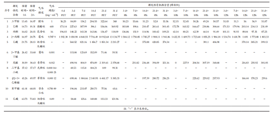 通過(guò)正構(gòu)烷烴標(biāo)樣計(jì)算保留指數(shù),利用AroChembase數(shù)據(jù)庫(kù)將0d樣品與所有樣品的差異色譜峰分別進(jìn)行定性及含量分析,可能含有的揮發(fā)性化合物見(jiàn)表3,此次試驗(yàn)所用儀器為質(zhì)量型檢測(cè)器-氫離子火焰監(jiān)測(cè)器,揮發(fā)性化合物含量的多少表征在峰面積上,表3中呈現(xiàn)了不同揮發(fā)性化合物的峰面積。結(jié)果顯示,三甲胺、乙醇、2-丙醇的含量隨著時(shí)間的增長(zhǎng)也隨之增長(zhǎng),在未阻隔的透明PET瓶樣品中增長(zhǎng)尤為明顯。戊醛作為光敏作用的產(chǎn)物之一,其存在于透明PET瓶所有檢測(cè)時(shí)間點(diǎn)內(nèi),阻光色油8%和10%阻隔PET瓶的7~31d,阻光色油12%阻隔PET瓶14~31d,且該物質(zhì)在透明PET瓶中的含量要遠(yuǎn)高于阻隔PET瓶。12%阻隔PET瓶中檢測(cè)到的時(shí)間晚于8%和10%阻隔PET瓶,可見(jiàn)稍高的質(zhì)量分?jǐn)?shù)對(duì)戊醛的產(chǎn)生有一定的延緩作用。2-甲基丁醛、二甲基二硫、苯甲醛和己酸僅在未避光的透明PET樣品檢測(cè)到,在14d達(dá)到頂峰而后下降。Kim等的研究表明,戊醛、2-丙醇和二甲基二硫是由光敏作用產(chǎn)生的,二甲基二硫會(huì)隨著光照時(shí)間的增加,濃度不斷增加。乙酸具有奶香味及酸味,可能存在于所有樣品,不同的是該化合物在透明PET瓶中的含量顯著高于有避光措施的阻光色油PET瓶樣品,其隨著光照時(shí)間的延長(zhǎng),乙酸含量也隨之增加。苯甲醛作為牛奶光氧化的特征化合物,在一定程度上表征了牛奶的品質(zhì)情況,其含量愈高品質(zhì)愈下降。由表3所示,苯甲醛出現(xiàn)在透明PET各時(shí)間點(diǎn)的樣品中,14d時(shí)最高,之后下降趨于平穩(wěn),結(jié)合感官品評(píng)結(jié)果來(lái)看,該樣品3d時(shí)非培訓(xùn)型評(píng)價(jià)員的整體喜好度已處于接受程度以下,可見(jiàn)光照嚴(yán)重影響了鮮牛奶的整體感官品質(zhì)。
