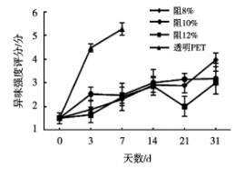 將滅菌后的鮮牛奶分別灌裝至4種PET阻隔瓶,而后將4種樣品置于光照強(qiáng)度3500-4000Lux,4-6℃儲(chǔ)存條件,分別在0,3,7,14,21和31d取樣進(jìn)行電子鼻檢測(cè)和感官品評(píng)。