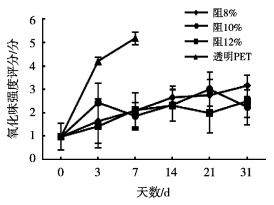 為研究光照對(duì)鮮牛奶品質(zhì)的影響,以透明PET瓶裝鮮牛奶以及添加不同質(zhì)量分?jǐn)?shù)的阻光色油PET阻隔瓶裝的鮮牛奶樣品為研究對(duì)象,對(duì)光照之后的鮮牛奶口味、氣味進(jìn)行分析,討論風(fēng)味變化的規(guī)律。