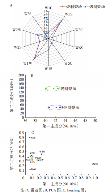 由圖1A可知,兩種梨湯在10種傳感器上的響應(yīng)各異,在W5S、W1W和W2W傳感器上的響應(yīng)值較大。由圖1B的PCA結(jié)果顯示,第一主成分(PC1)和第二主成分(PC2)的貢獻(xiàn)率分別為96.16%和3.04%,總貢獻(xiàn)率為99.20%,充分涵蓋了兩種梨湯樣品的主要信息,燉制梨湯和烤制梨湯能夠完全分離,說(shuō)明其氣味具有明顯差異。Loading分析可用于判斷各傳感器對(duì)樣品的區(qū)分能力,各傳感器在某主成分軸上的特征向量絕對(duì)值越大,表示該傳感器對(duì)此主成分的貢獻(xiàn)率越大。由圖1C可知,傳感器W5S對(duì)樣品區(qū)分能力最佳,其次為W1W、W2W、W1S和W2S,其中W5S對(duì)第一主成分貢獻(xiàn)率最大,W1S對(duì)第二主成分貢獻(xiàn)率最大。