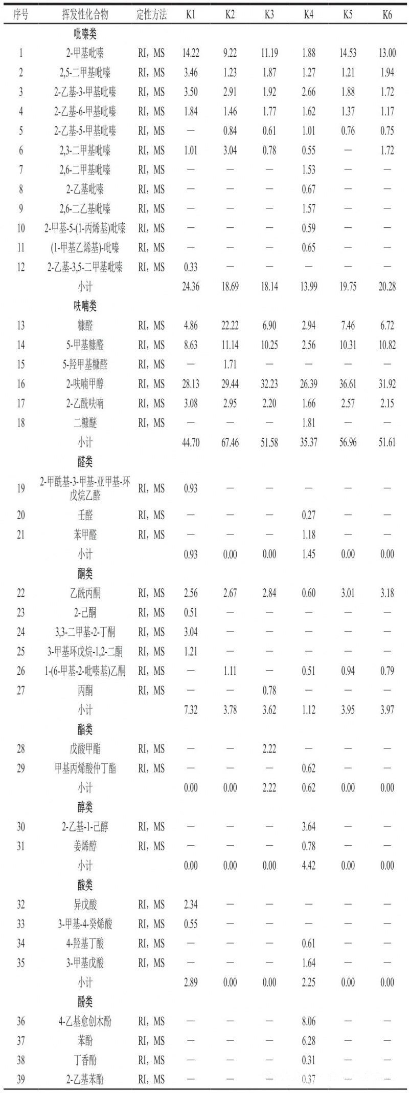 02 不同咖啡的滋味輪廓分析利用電子舌快速分析滋味輪廓,如圖2A所示。6種樣品的雷達(dá)圖輪廓類似,只有酸味傳感器的響應(yīng)值為負(fù),說明酸味對咖啡整體滋味的貢獻(xiàn)較小。各樣品在鮮味與咸味傳感器上的響應(yīng)值差異最大,表明這兩種傳感器對滋味特征的區(qū)分效果最好。為根據(jù)滋味特征進(jìn)一步區(qū)分6種咖啡,對電子舌傳感器響應(yīng)值結(jié)果進(jìn)行PCA(圖2B)。6種咖啡輪廓未重疊,滋味特征明顯,易被區(qū)分。K3、K5和K6咖啡在PC1的正方向,主要受鮮味、咸味、厚味影響;K1、K2和K4咖啡在PC1的負(fù)方向,主要由澀味、酸味、苦味影響(圖2C)。每個樣品聚類的距離與滋味特征接近度相關(guān),有相同咖啡配比的K1~K4樣品,烘焙程度不同,距離較遠(yuǎn),說明電子舌可以區(qū)分不同烘焙度的咖啡。K5、K6咖啡分別與K1、K3咖啡輪廓接近,說明不同的咖啡配比在一定程度上能夠彌補(bǔ)烘焙程度的差異,使不同烘焙度的咖啡具有類似的滋味輪廓。