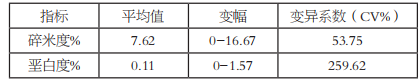 45個(gè)稻米樣品的碎米度平均值為7.62%,堊白度的平均值為0.11%,變異系數(shù)為259.62%,表明不同樣品間的堊白度差異較大,其中8號樣品最高。樣品6,9,11,12的碎米度和堊白度均較小,且其評級為優(yōu)質(zhì)一級,表明外觀品質(zhì)優(yōu)良。