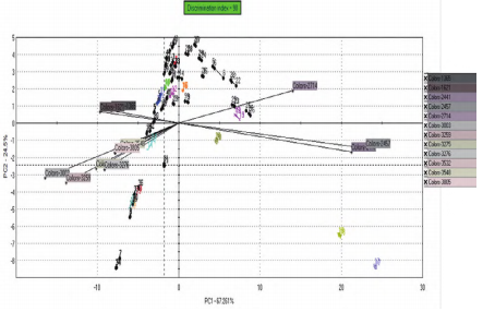 經(jīng)過篩選重要顏色頻譜進(jìn)行PCA分析,樣品間的區(qū)分指數(shù)為98,說明45批大米在色澤上存在著一定的差異,電子眼能夠區(qū)分開不同的大米樣品。第一主成分軸(PC1)占67.261%,第二主成分軸(PC2)占24.5%。說明主要差異集中在橫軸上,即在橫軸上距離越遠(yuǎn),差異越大。樣品17,18在右下角,游離在其他樣品之外,說明與其他樣本在色澤上的差異較大。樣品3和樣品7分布在相近的區(qū)域,樣品2、8、13、15、36、37、40處在相近區(qū)域,其他剩余樣本集中在相近區(qū)域。主成分分析能顯示出45個(gè)樣本間所有的差異。(如圖1所示)
