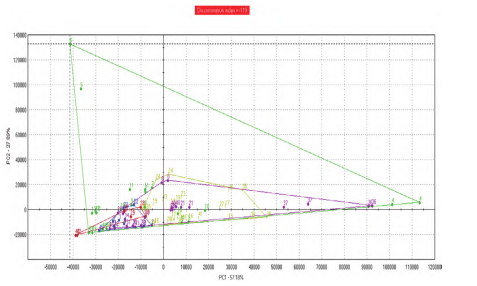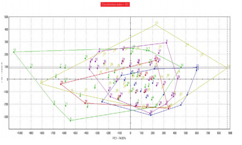 電子眼、電子鼻、電子舌的分析結(jié)果可以與人的感官評分結(jié)果進(jìn)行擬合,從而實(shí)現(xiàn)未知樣品外觀表型數(shù)據(jù)及香味強(qiáng)度值、滋味值的預(yù)測,建立的聚類分析模型,可實(shí)現(xiàn)產(chǎn)地溯源及品種鑒定等聚類分析功能。通過同一樣品不同時(shí)期的數(shù)據(jù)采集,可以建立產(chǎn)品貨架期模型,實(shí)現(xiàn)對產(chǎn)品穩(wěn)定性的有效評價(jià)。