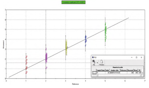 PLS模型是一種偏最小二乘回歸分析模型,使用已知感官得分的參考樣品來設(shè)置標(biāo)準(zhǔn)曲線,并根據(jù)變量的不同權(quán)重,計(jì)算各變量的回歸系數(shù),建立回歸方程,模型相關(guān)系數(shù)>0.8為合格。常用來預(yù)測感官得分和評級。將大米品質(zhì)的不同級別分別對應(yīng)1-5分,并將對應(yīng)打分賦予各個(gè)樣品,而后建立PLS模型(如圖5所示)。由圖8得出,相關(guān)系數(shù)0.9013>0.8,模型合格。將樣品19的一個(gè)平行樣在模型中投射,可得模型計(jì)算得分為3.05分,屬于優(yōu)質(zhì)三級大米,與人工評級相符,后續(xù)可嘗試用此模型對新批次樣品進(jìn)行等級評價(jià)。
