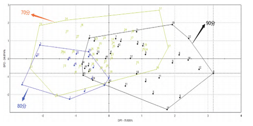 優(yōu)質(zhì)一二三級粳米對應(yīng)的品嘗評分值為90/80/70,單獨(dú)選擇優(yōu)質(zhì)一二三級樣品,并運(yùn)行DFA模型。模型圖(如圖8所示)中有部分區(qū)域重疊,說明優(yōu)質(zhì)粳米間的滋味區(qū)分不明顯。其次是國標(biāo)中的品嘗評分值是結(jié)合了氣味/外觀結(jié)構(gòu)/適口性/滋味/冷飯質(zhì)地得到的綜合結(jié)果,數(shù)據(jù)的對應(yīng)上有所偏差。