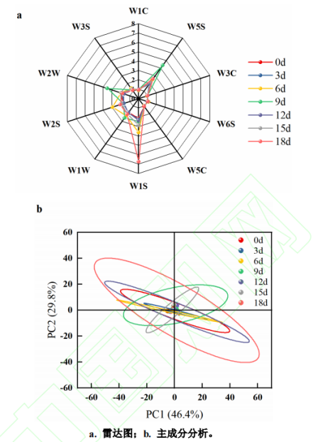 漿水青稞奶茶4℃貯藏過程呈味物質(zhì)的變化如圖5所示。由圖5a可知,10個(gè)傳感器中對漿水青稞奶茶響應(yīng)強(qiáng)度較大的傳感器有W1S、W5S、W2W,它們分別對應(yīng)甲基類、氮氧化合物和有機(jī)硫化物的靈敏性。隨著貯藏時(shí)間的延長,第18天漿水青稞奶茶在W1S傳感器上響應(yīng)值差異最為明顯,這可能是因蛋白質(zhì)分解過程中產(chǎn)生了甲烷等物質(zhì)物。為進(jìn)一步明確不同貯藏期間漿水青稞奶茶風(fēng)味特征的差異,對電子鼻傳感器的響應(yīng)值進(jìn)行了主成分分析(PCA)。由圖5b可知,4℃貯藏漿水青稞奶茶的第一主成分貢獻(xiàn)率為46.4%,第二主成分貢獻(xiàn)率為29.8%,累積貢獻(xiàn)率達(dá)76.2%,說明不同貯藏時(shí)間的奶茶樣本間揮發(fā)性氣味存在一定差異,其中第一主成分起到了最為關(guān)鍵的作用,使用電子鼻能夠準(zhǔn)確識(shí)別和區(qū)分。而貯藏18d內(nèi)奶茶氣味響應(yīng)值空間距離較近,說明漿水青稞奶茶貯藏過程中風(fēng)味輪廓未發(fā)生明顯變化,低溫有利于保持漿水青稞奶茶的風(fēng)味的流失。