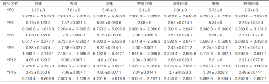 表1 三氯蔗糖與輔料矯味組合味覺信息測(cè)定值的均值 ± 標(biāo)準(zhǔn)差、95% 置信區(qū)間表2甜菊糖苷與輔料矯味組合味覺信息測(cè)定值的均值 ± 標(biāo)準(zhǔn)差、95% 置信區(qū)間表3阿斯巴甜與輔料矯味組合味覺信息測(cè)定值的均值 ± 標(biāo)準(zhǔn)差、95% 置信區(qū)間根據(jù)表1~3,選出甜味、鮮味、鮮味回味較高值的樣品,苦味、苦味回味、澀味、澀味回味較低值的樣品,即選出樣品 10、11、13、14 共 4 個(gè)樣品作為進(jìn)一步研究的對(duì)象,篩選結(jié)果見表4。