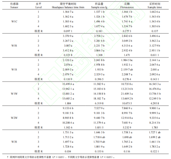 不同因素對(duì)電子鼻響應(yīng)特性的影響不同因素對(duì)電子鼻各傳感器(W1C、W5S、W1S、W1W、W2W和W3S傳感器)的影響見表1。從表3可知,不同因素對(duì)電子鼻測(cè)定櫻花花香的影響差異顯著,對(duì)電子鼻傳感器的響應(yīng)影響從大到小依次是不同花期、樣量、采樣時(shí)間,在不同頂空平衡時(shí)間因素下電子鼻各傳感器響應(yīng)極差均最小。從各因素的不同水平看,在不同頂空平衡時(shí)間因素中,水平1、4高于水平2、3;樣品量中水平4的電子鼻各傳感器響應(yīng)值顯著高于其他水平,水平1、2、3差異不顯著;在不同花期因素下,除了W1S傳感器之外,其余傳感器在水平3時(shí)的響應(yīng)值高于其他水平,且與其他水平差異極顯著;采樣時(shí)間中各水平差異不顯著。說明電子鼻對(duì)盛開時(shí)期的櫻花花朵且樣品量為4g時(shí)響應(yīng)較大。