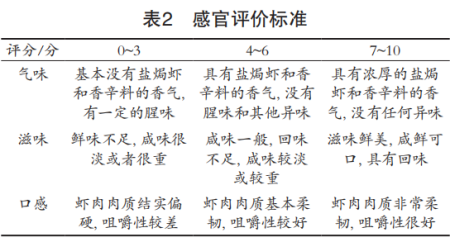 感官評價(jià)小組(8人)從鹽焗蝦的口感、滋味和氣味3個方面評定其品質(zhì),每項(xiàng)滿分為10分,感官評價(jià)總分為30分,評分標(biāo)準(zhǔn)見表1。