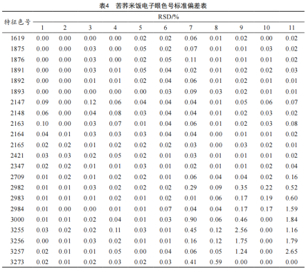 通過電子眼檢測,占比在1%以上的特征色號(hào)有22個(gè)。其中,隨著苦蕎米添加量的增加,占比在增大的特征色號(hào)有13個(gè),如:1619、1875、1876、1891、1892、1893、2147、2148、2163、2164、2165、2421、2437;隨著苦蕎米添加量的增加占比在減少的特征色號(hào)有9個(gè),如:2709、2982、2983、2984、3000、3255、3256、3257、3273。為驗(yàn)證電子眼采集圖像的穩(wěn)定性,以確保實(shí)驗(yàn)數(shù)據(jù)的可靠性,計(jì)算樣本的相對標(biāo)準(zhǔn)偏差(Relative standard deviation, RSD),結(jié)果如表4所示。樣本特征色號(hào)RSD值均小于5%,表明電子眼采集的苦蕎米飯色澤數(shù)據(jù)具有良好的重現(xiàn)性,可滿足后續(xù)分析。
