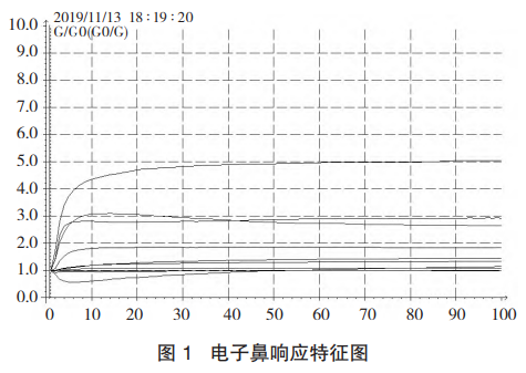精確稱取茯苓粉2.0g,放入200mL頂空取樣杯中,檢測后密封。在室溫下重復測量5次。預采樣階段5s后,電子鼻測量時間設置為100s,沖洗時間為60s。腔內流速為300mL·min-1,初始注射流速為300mL·min-1。這10個電子鼻傳感器的響應曲線如圖1所示。在測量過程中,各傳感器的響應值在70s后逐漸增大,然后趨于穩(wěn)定,因此提取80s的信號作為原始數(shù)據(jù)。