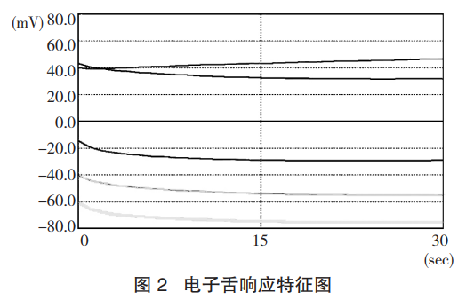 精確稱取茯苓粉2.0g,用100mL純凈水溶解,回流提取1h,得到濾液,冷卻過濾。取30mL濾液到電子舌專用燒杯中。電子舌傳感器和參考電極在安裝前應在激活液中激活24h。隨后,在測量過程中使用基準液校正使數(shù)據(jù)穩(wěn)定。所有樣品在25℃室溫下測定,以基準液作為清洗液。在1r·s-1攪拌速度條件下,傳感器持續(xù)清洗120s后測量30s。如圖2所示,每個傳感器的響應信號直到15s時穩(wěn)定,因此提取30s時的響應值進行進一步分析。